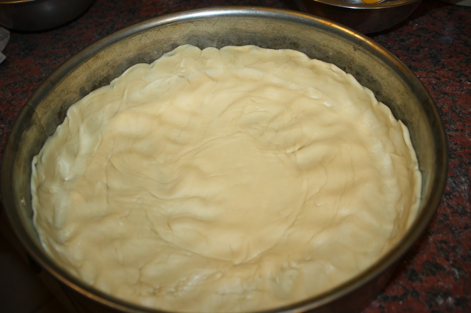 Pakilusią tešlą pakočiojame ant stalo lengvai pabarstyto miltais.Tešlą klojame į skardą ir šiek tiek (apie 3 cm ) pakeliame kraštą aukštyn . Dugną pabadome šakute.