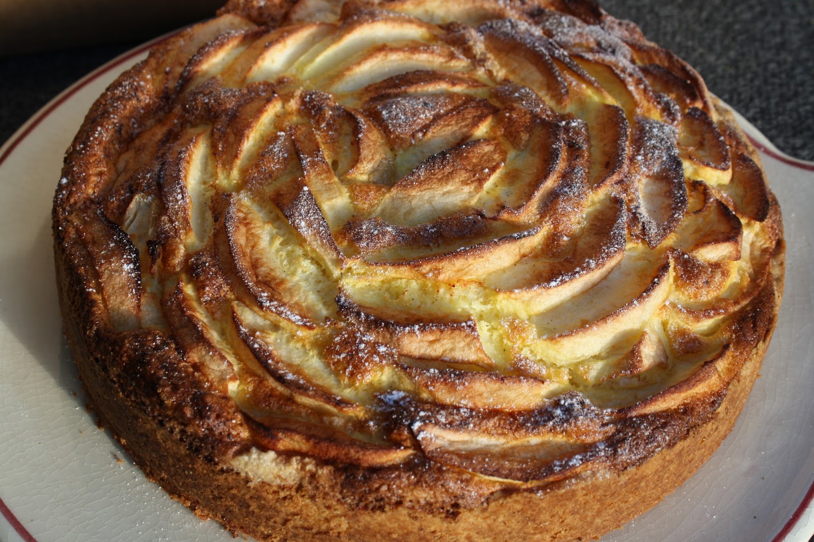 Paruoštą įdarą užpilti ant tešlos. Ant viršaus išdėlioti obuolių skilteles, nereikia jų specialiai spausti į tešlą,užteks kiek pačios panirs.